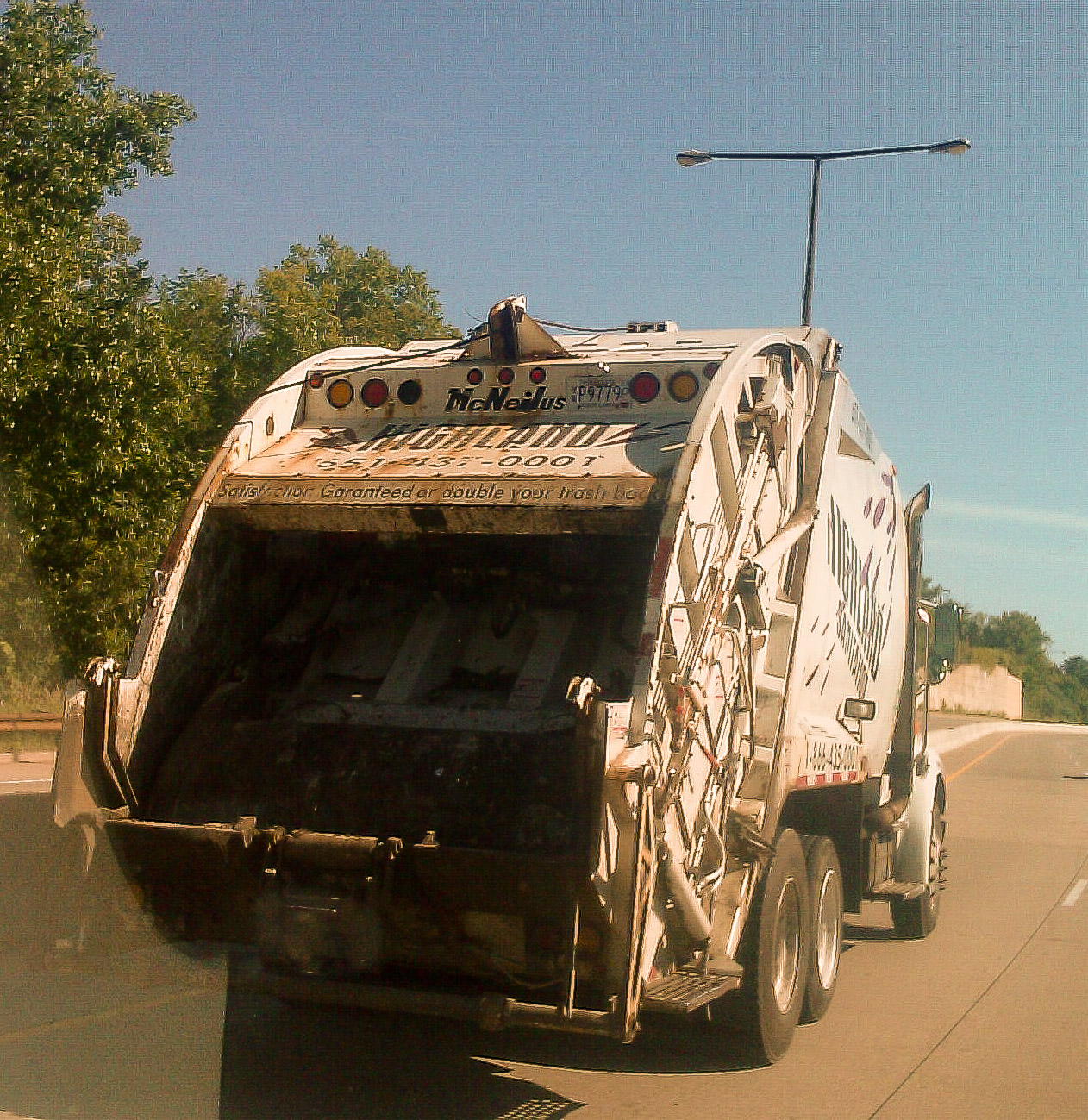 The slogan on the garbage truck is “Satisfaction Guaranteed or Double Your Trash Back”.