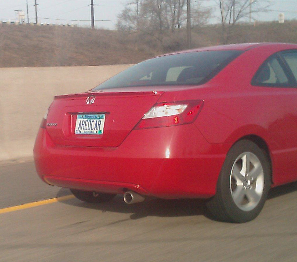 ..but I can dig it. (License plate: ‘A RED CAR’. On a red car. A red Honda Civic to be specific.)