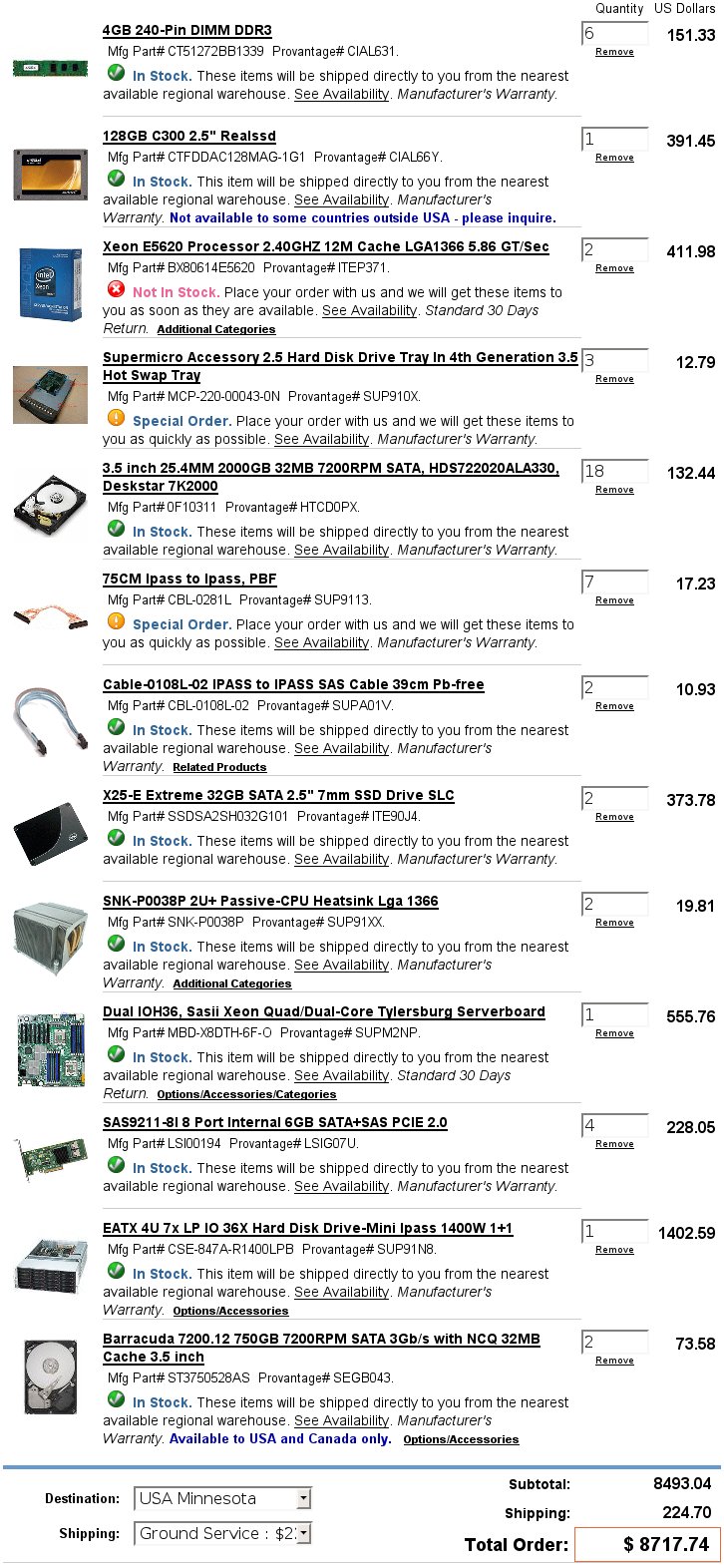 We purchased the system from CDW, with our own customer-specific pricing. I’m not allowed to share what we paid, but for your reference, I’ve whipped up a shopping cart at Provantage with (essentially) the same components. There is no special pricing here; this is just the pricing that their web site listed as of May 8 2010 at 11:18am central time. Note: I have no affiliation with Provantage. I have ordered from them previously, and enjoyed their service, but cannot guarantee you will have a good experience there. The prices here may or may not be valid if you go to order. You may be able to get better pricing by talking to a customer service rep there. I also had to change a few components for parts that Provantage did not have available – namely some of the various lengths of SFF-8087 cables. I error’d on the side of ‘long’, so it should work, but I haven’t built a system with those exact cables, so can’t guarantee anything.