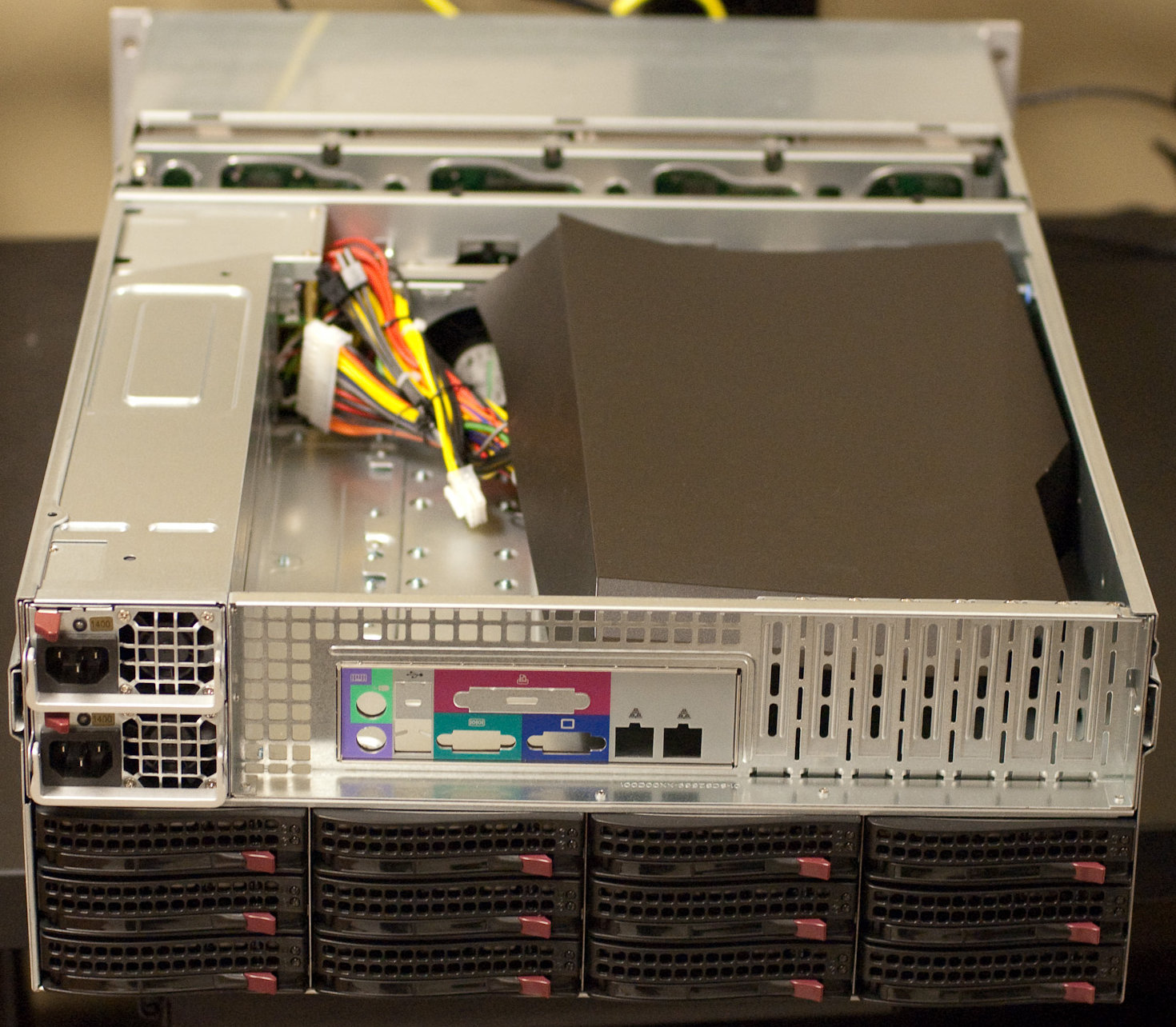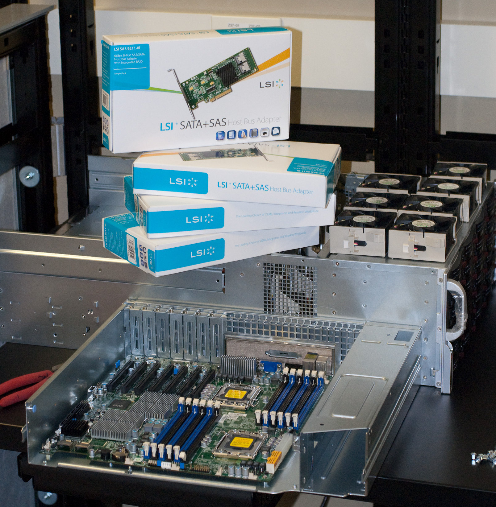 The build-out on the system went fine for the most part; the only problem I ran into is that the motherboard did not have a BIOS installed which supported the relatively new Westmere processors. Fortunately I had a Nehalem E5520 I could borrow from another system to get the BIOS upgraded.. I wish the BIOS recovery procedure would work for unsupported processors, but ah well. I was pleased with the way the motherboard tray slides out; it makes it easy to get the cabling tucked underneath and routed so that they will not interfere with airflow. There also seems to be plenty of airflow to keep the 36 drives cooled.