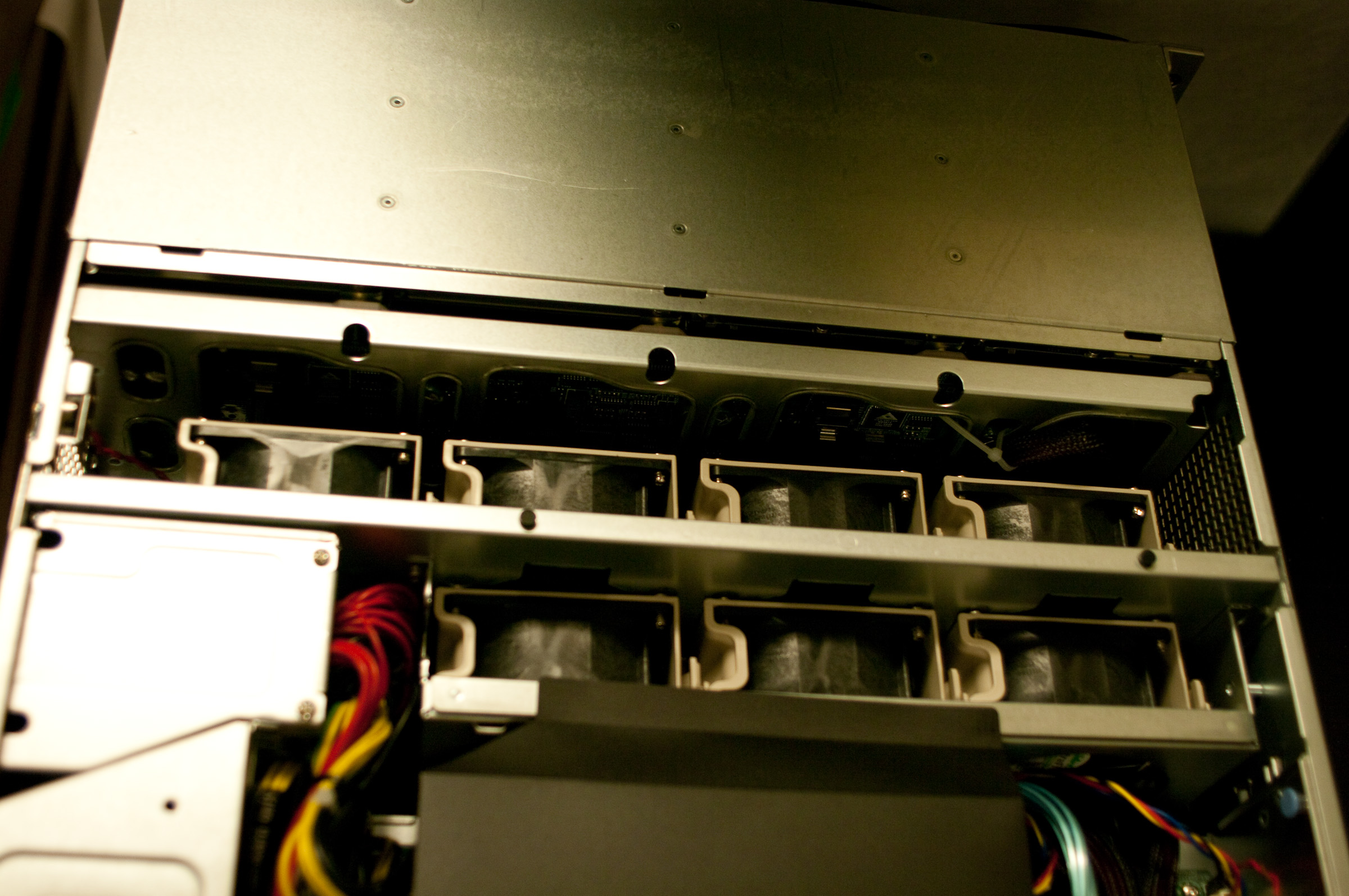 Another shot of the front backplane. You can see the five of the six SFF-8087 connectors (the other is on the right-hand side of the backplane which is not visible.) Also note the fans that I’ve removed to get better access to the backplane.
