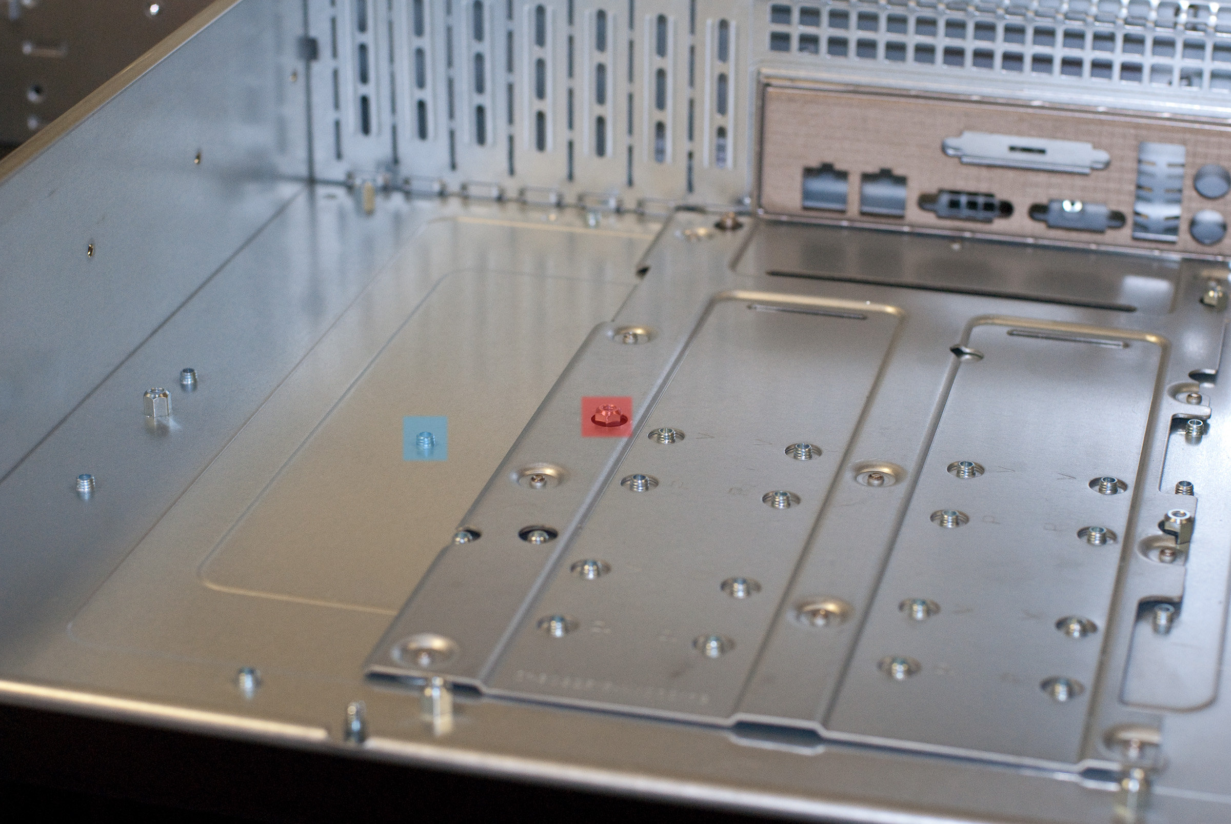 Motherboard tray before installing the motherboard. This tray uses a different style screw system than I’ve seen before; instead of having threaded holes that you screw standoffs into, they have standoffs coming up off the bottom (one highlighted in blue), which you screw an adapter onto (highlighted in red) which the motherboard rests on and is secured to.