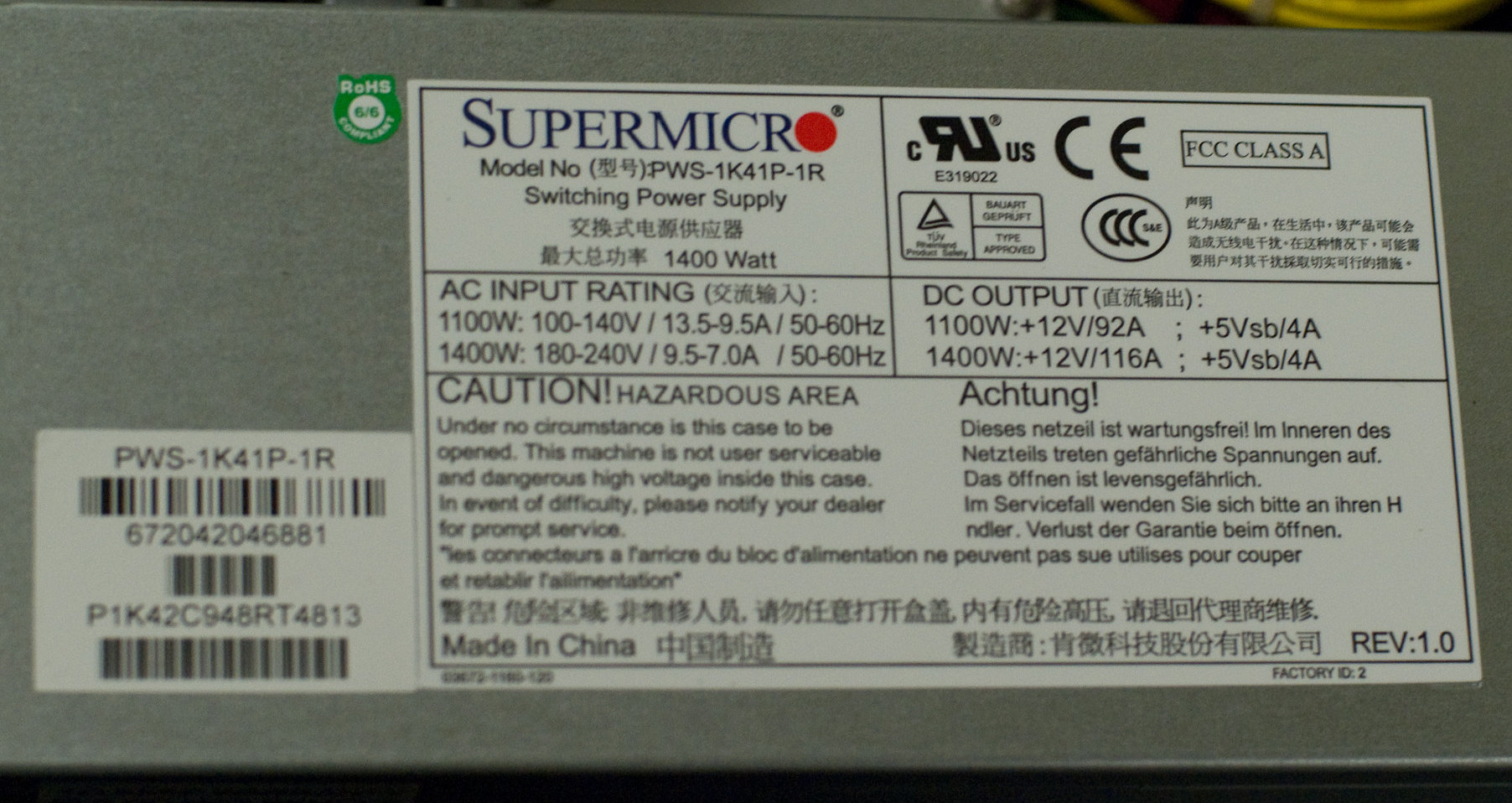 Labels on one of the power supplies. This system includes a pair of ‘PWS-1K41P-1R’ power supplies, which output 1400W at 220V or 1100W at 120V.